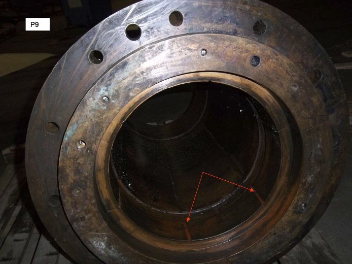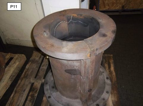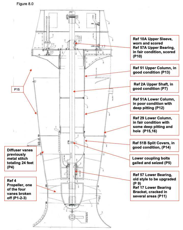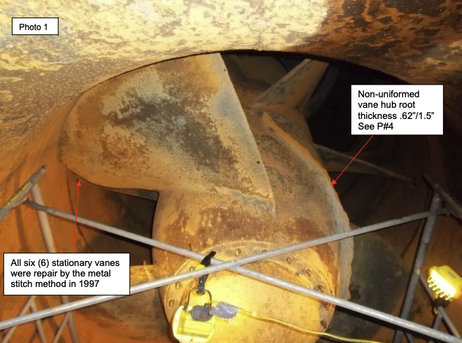 Propeller Failure: The 119″ impellers had fractured vanes weighing over 600 lbs each, with Pump No. 1 missing an entire vane. The failure was linked to latent defects in the original 1960s Ni-Resist castings, including brittle material and poor vane hub root thickness design.